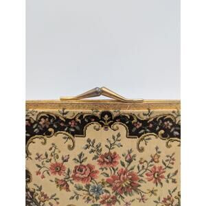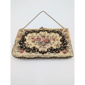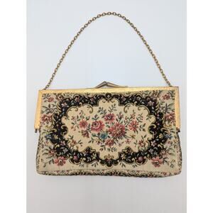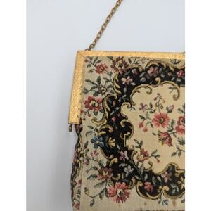 A stunning piece of history to make part of your collection! A vintage handbag from the 1940s with a beautiful floral petit point embroidered tapestry design. The clasp is gold-painted kisslock with a 15 in. long chain strap. The bag is in good vintage condition, with flaws of note being 3 small discoloration marks on one side, visibly repaired stitching on one side to reconnect bag to frame, and a broken hinge on the other side. All flaws visible in pictures, and purse still opens and closes with ease.