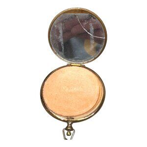 Compact shows minor vintage wear including light scratches on mirror surface and a crack. Measures approximately 2.75 inches in diameter.