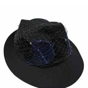 * Around the hat there are blue and black velvet cut out leaf shapes covered by black veil that is gathered in the back.