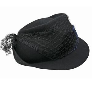 Vintage 1940s Hat Black Shaped Wide Brim w Velvet Appliques Net Veil - Hey Viv