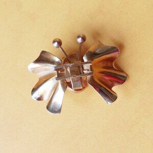 Crafted in warm gold tone with sculpted, wing-like petals and topped with a carved faux turquoise scarab center, this piece truly flutters with personality. Two sparkling rhinestone antennae add a playful touch of glamour, while the classic dual-prong fur clip backing keeps it secure on lapels, scarves, or thicker fabrics. Compact yet eye-catching, it’s a rare and delightful design that embodies the creativity of 1940s costume jewelry.