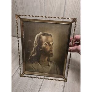 Vintage 1940s Lithograph Jesus Christ Brass Twisted Frame Lord Savior Religious