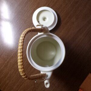 Perfect for your Fall table. Charming Japanese OMC tea set - teapot with wicker handle and four cups. The decoration features quail and chrysanthemums in brown, gold, and orange with purple accent flowers.