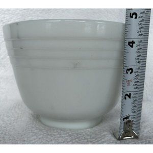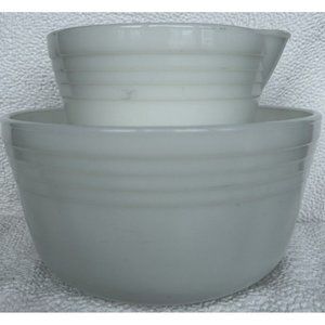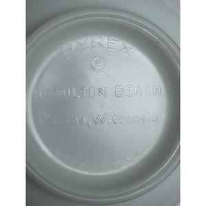 This vintage set of two PYREX mixing bowls is a must-have for any collector of farmhouse-style decor. The bowls are made of opal glass and feature a solid white color with a ribbed pattern. The set includes one 11-cup mixing bowl and one 4 1/2-cup mixing bowl. The bowls say PYREX Hamilton Beach Racine, Wisconsin on the bottom.