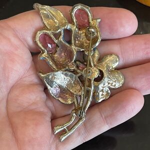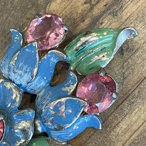 Vintage 1940’s signed Made in USA pot metal enamel rhinestone flower brooch pin. Condition - has some enamel loss as typically seen on these brooches of this age & era. Also the rhinestones have age and wear to them typical with these brooches.
