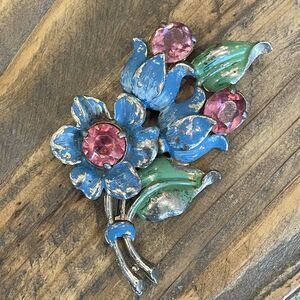 Vintage 1940's Pot Metal Rhinestone Enamel Floral Bouquet Brooch "MADE IN USA"
