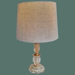Petite boudoir lamp from the early mid century "Hollywood regency" style lamp body made from stacked hobnail glass pieces with brass spacers, an ornate base that makes it sturdy, and finished with a current grey linen look fabric lamp. Has original socket and cord which work fine. Measures 16" tall with the shade.