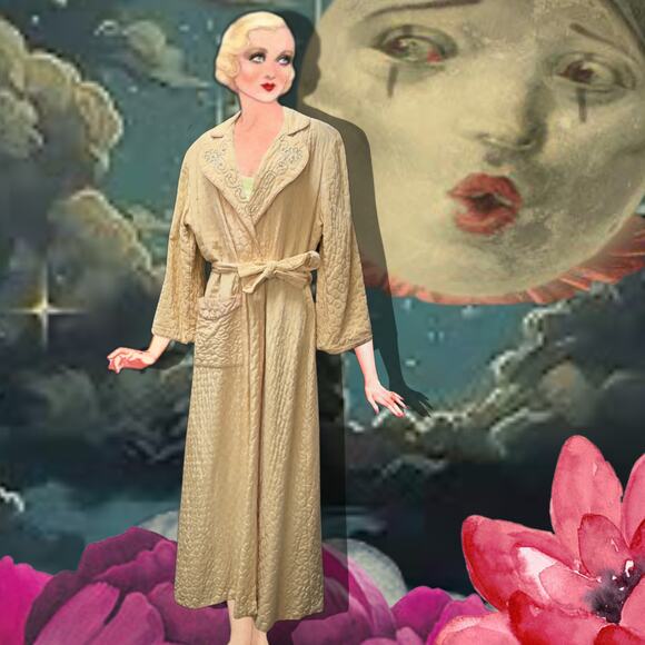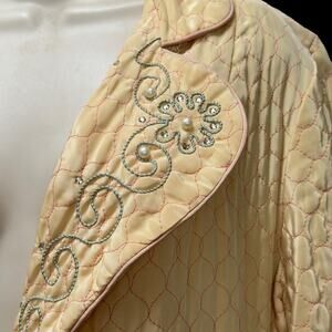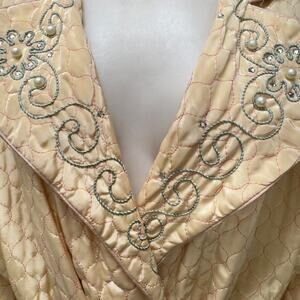 Peach quilted satin 1940s robe with original sash, rhinestone and faux pearl details, and beautiful raised embroidery at the collar.