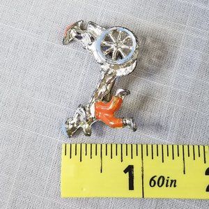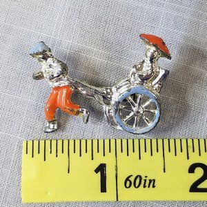 A cute and fun vintage pin from the 1930s-1940s depicting a rickshaw- a lightweight cart for transporting people, carried by a person. Silver tone metal with painted enamel accents. In used condition with wear to some areas of the enamel.