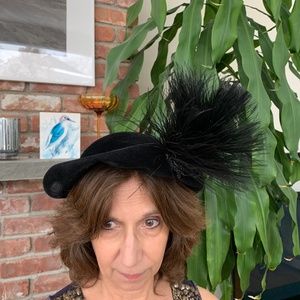 Beautiful and unique vintage 1940s black wool hat with feather, beading, and two hat pins. Saks Fifth Avenue Debutante tag. Imprint reads Vita, Made in Czechoslovakia. Front rim to back rim 7.5 inches. 7 inch interior diameter. Excellent condition. May need a few days to ship to find appropriate box!