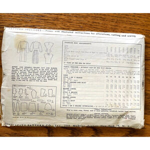 Womens Bolero Suit & Blouse. The bolero is fitted w/ darts at the front & back shoulder, & the front edges are outlined w/ scallops. Lining is optional. Three-quarter sleeves gathered to a band at the lower edge or long fitted sleeves may be used. The wrap-around skirt is fitted w/ tucks at the upper left side & joins to a waist band. The blouse is made w/ extended shoulders & a bias bound neck edge. A bow may be used to trim the neck.