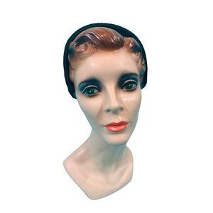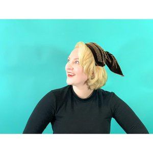A vintage 1940s headband hat in a brown velvet with cream beaded detail, wire headband and a white round ponytail around the back forming a ponytail. This hat/headband is very unique and is like a mash up of a snood/hat/headband. Has a satin lining and is somewhat adjustable with the wire in the headband part.