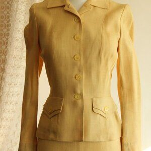 Wonderful vintage suit from the 1950s in yellow linen. Consists of a skirt and jacket. Jacket is a tailored New Look style with hip pockets and with striking double flaps. The skirt is a mild A line and has a side zipper with button at the top. Both jacket and skirt are unlined. Label reads: Arthur Jay. Extra small to small I'd say but do see measurements below.