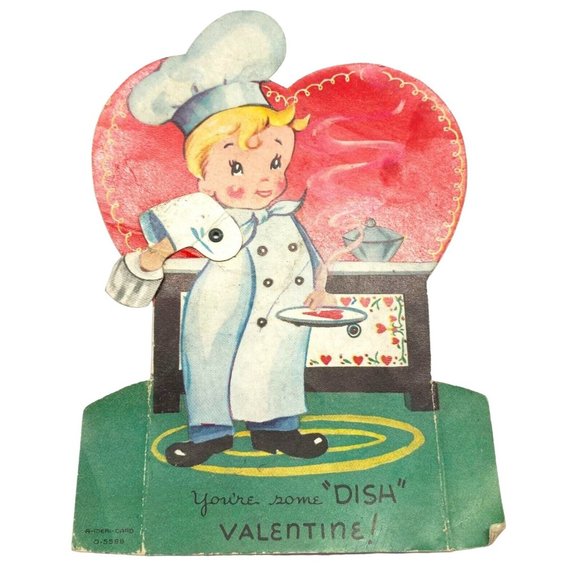 Vintage 1940s Valentine Greeting Card Chef Dish Mechanical 6.5" Diecut