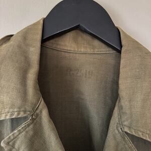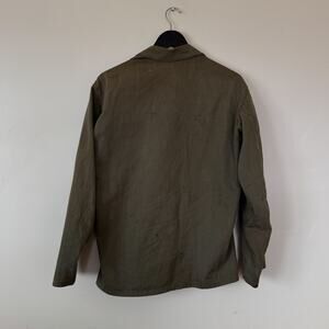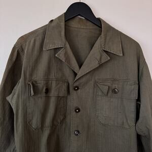 Vintage 1940s WWII U.S. Army military jacket or could be worn as a shirt. Made of green herringbone twill cotton. Has two chest patch flap pockets, button front, and plastic buttons. About a size medium.