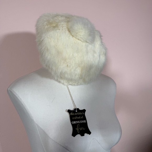 Adorable white rabbit fur hat in a charming Barrett style. Sweet easy to wear hat that sits on top of your head with an elastic band inside. Real white rabbit fur with natural variations from a pure white to a creamy winter white. Slightly floppy design can be pulled over to one side at a Jonty angle. Flirty top knot Pom Pom sits at the top of your hat giving playful style.