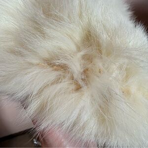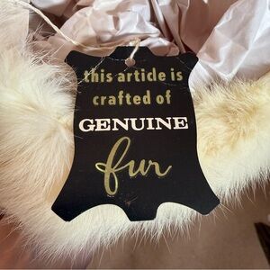 New with tags but has a small flaw where a repair was made. It is hard to tell with all the fluffy fur but there is a bit where you can see some of the leather. And two tiny rust marks from an old safety pin on the elastic. Otherwise excellent condition.
