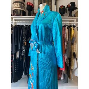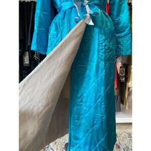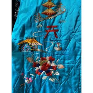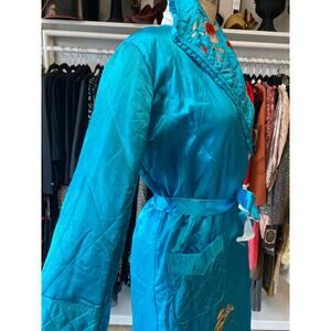 Vintage 1940s quilted Japanese robe, turquoise embroidered satin, 40s loungewear