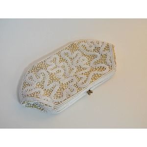 Vintage 1940s white cream tan beaded clutch wallet purse