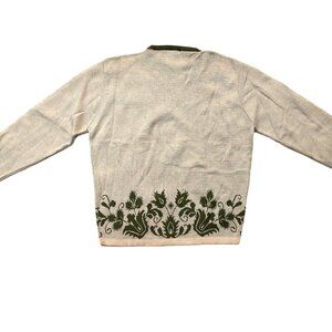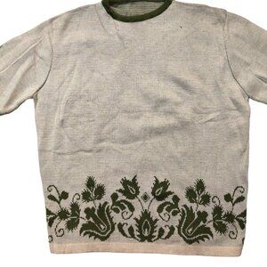 Vintage 1940s-1950s 3/4 Sleeve Crewneck Beige Olive Green Floral Woven Sweater