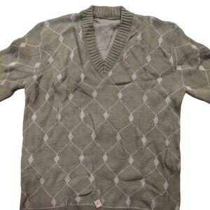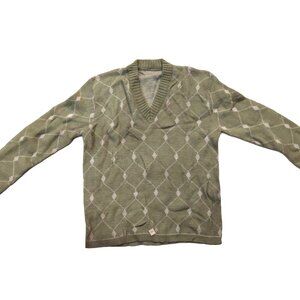Vintage 1940s-1950s Olive/Pea Green Beige Woven Print Long Sleeve Knit V-Neck Sweater