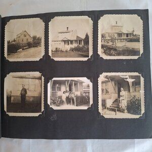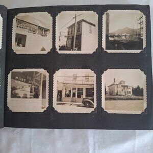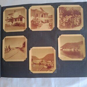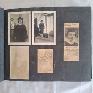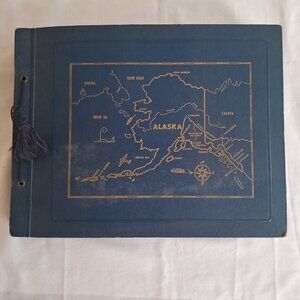 Vintage photograph album, approximately 13 by 10 inches, 1 1/2 inches thick, blue heavy card cover with embossed map of Alaska. Sampling of photos are shown here. There are a couple of newspaper clips which help to date and identify. This album belonged to a woman who grew up in Massachusetts, attended Framingham State (then predominately a teacher's college), graduated, and moved to Petersburg, Alaska, to establish a home economics department at their high school, where she also taught art. The photos include some airport scenes and airplane views of her arrival, what was probably the home in which she lived, typical photos of friends/family, a good number of harbor views, fishery related views, downtown - post office, stores, Hotel Arctic - some views which appear to be taken at work (school), a lot of ocean tankers/fishing vessels, etc. A handwritten note seems to describe some of the photos in the album and indicates that she spent 22 years in Alaska and was there definitively in 1951. There is a photo processor envelope with a 1956 date. I'd date the date at late 1940s through the 1950s. The album has some of the phots glued down, some mounted with photo corners, and some attached with bits of tape. There are a few photos that are damaged, scraped from maybe have become stuck together at some point. Total photos: 358, along with a few postcards, a couple of photo negatives, and some miscellaneous items.
