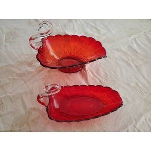 Vintage 1940s-1960s Heirloom Collectible Large Ruby Red Fluted Art Glass Crystal Swan Candy/Nut Dishes