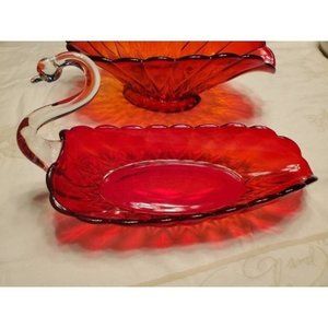 Vintage 1940s-1960s Heirloom Large Ruby Red Fluted Art Glass Crystal Swan Dished