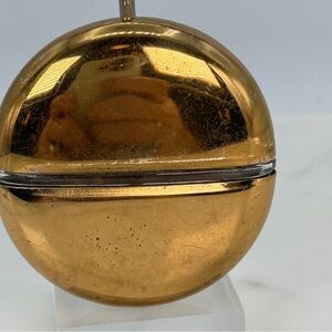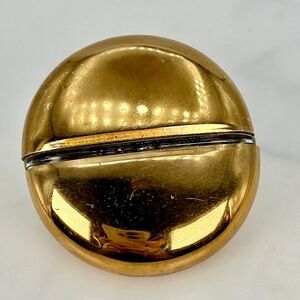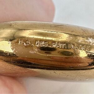 Here is a mid-century Mary Dunhill Scentinel travel perfume case. The case is stamped MARY DUNHILL on one end and U.S. DES. PAT. 105298 (which was granted in 1937) on the other end. The perfume holder is about 2" x 2"; there's a 1/8" lip on the molded glass perfume bottle that shows the bottle's contents. The glass bottle fits snug inside the gold plated metal case.