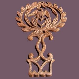 Wonderful cast iron trivet featuring a 5.5" diameter laurel wreath with an eagle and heart in the center above a set of flourishes that form a handle and make the trivet 8.5" long, and four sturdy small feet that raise it .75" from a surface. This version of this collectible trivet made by John Zimmerman Harner is plated in copper that has been recently cleaned and is surprisingly bright for a 76 year old utilitarian kitchen tool. Excellent condition and completely functional.