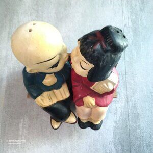 Vintage 1950 Asian Boy & Girl Kissing on Park Bench Salt & Pepper Set