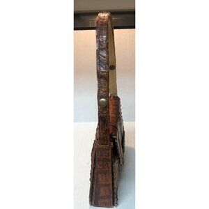 Old, vintage alligator handbag purse that was found in an antique store and to contain a handwritten note that says "This alligator purse was a gift from my parents when they visited Cuba in 1950". Labeling inside says "Real Alligator Made in Cuba". 5-1/4" tall X 6-3/4" side X 1-7/8" deep X 6-1/2" handle drop X 5/8" wide handle. Its brown and tan colors have been brought out with a special reptile leather cleaning product Seller purchased just for this purpose bag. Even though it needs a lot of work, it could be carried or displayed as-is (which is what the Seller will do unless someone buys it). Most seams and corners have been compromised, strap is split half-through on one side where attaches to main body, inside bottom surface is tearing away. All said - and visibly apparent in photos - it is still a sweet little bag that hard to find.