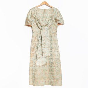Vintage 1950s 1960s Green Orange Asian Inspired Floral Crane Brocade Silk Dress with Shawl