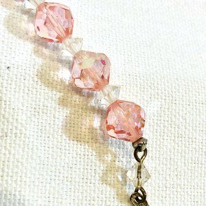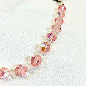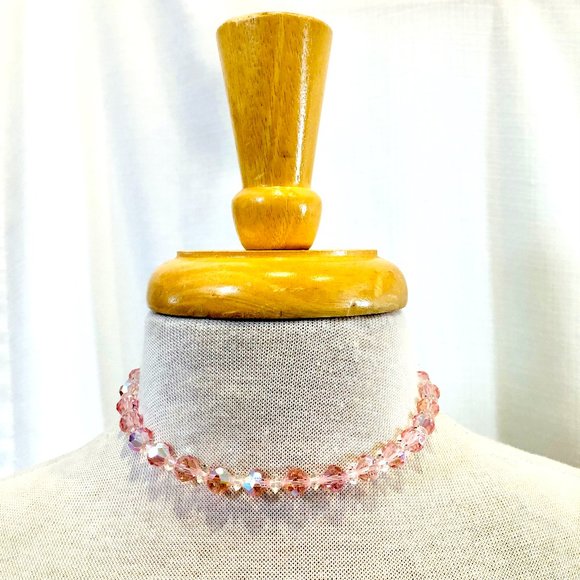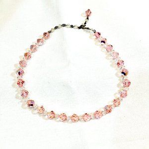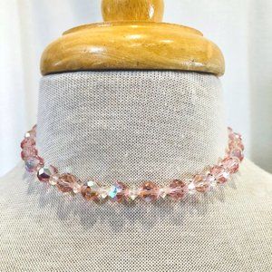 Crystal choker necklace from circa the 1950s! Faceted crystal glass beads in the lightest, delicate shade of pink, with a slight aurora effect. Clear smaller, flatter beads between each bigger ones. Mate silver tone metal chain. Hook closure with single pink bead at the end. No maker's marks or tags. Necklace has some weight to it. The pictures do not show all the sparkle! Very pretty for your special event or party!