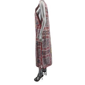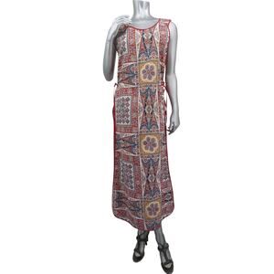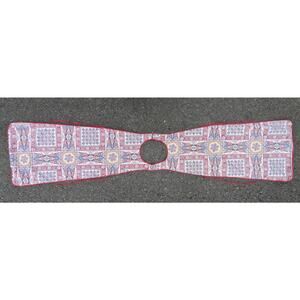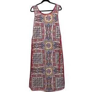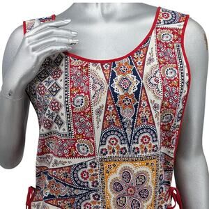 Cute pull-over open-sided reversible (front-to-back) smock apron the likes of which my grandmother wore as she whipped up lunch for 200 high school students as a school cook. 100% thick cotton in a retro faux-patchwork design in bright primary colors. Complicated geometric & floral patterns. Apron has a large scoop hole for the neck & two ties, one on each side. The ties are made out of some kind of narrow hem-finishing cotton tape. Good vintage condition - fabric is crisp & bright - I see one yellowish stain right under a yellow 'box' that may be dye-bleed from a manufacturer's printing defect as it doesn't show on the backside of the fabric. Areas around ties have been reinforced/repaired.