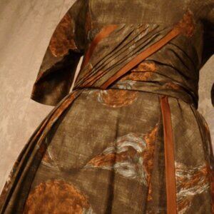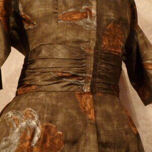 Charcoal brown background with oversized fall floral acorn print in shades of orange, gold & russet. Wide ruched waist-band with falling sash trimmed in russet satin. 24" back center metal zipper. Jewel length kimono sleeves. The skirt is quite full with an A-line flare. Lined with matching russet acetate lining from top of waist-band to hem. (Bodice area is not lined.)
