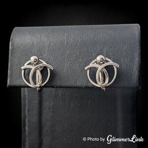 Vintage mid-century earrings by Alice Jewelry Company of Providence, Rhode Island (active 1950s–1970s). Crafted in bright silver tone metal, the design features an abstract openwork circle and arc motif topped with a polished bead—an excellent example of modernist jewelry style.