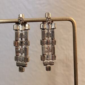 Vintage 1950s Art Deco Inspired Pink Baguette Drop Earrings. Pre-owned, these pink baguette crystal rhinestone dangle earrings are in excellent vintage condition.
