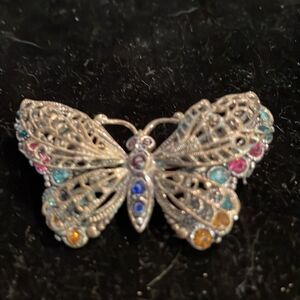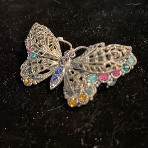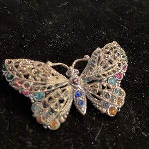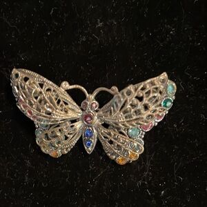 Vintage 1950s Art Deco pewter filigree butterfly brooch with gems