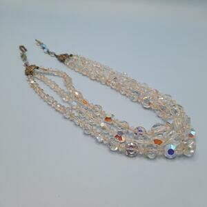 Add a touch of vintage glamour to your look with this stunning mid-century Aurora Borealis crystal necklace! This beautiful three-strand necklace features dazzling crystals that shimmer with a rainbow of colors.