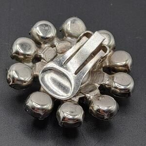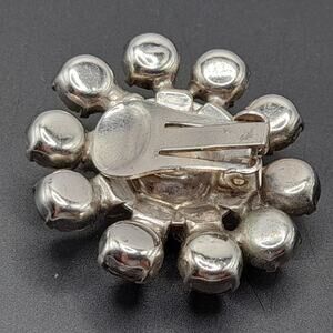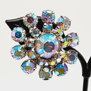 Add timeless sparkle to your collection with this gorgeous pair of 1950s vintage aurora borealis rhinestone clip earrings. Each earring features a flower burst design on rhodium plated metal, set with prong-set faceted AB stones that shift beautifully under the light — perfect for weddings, parties, or holiday outfits.
