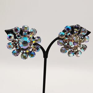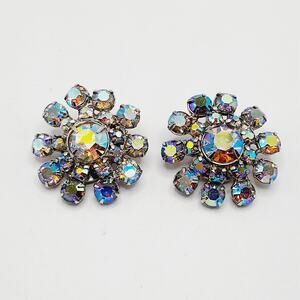Vintage 1950s Aurora Borealis Rhinestone Flower Clip Earrings 1.25”