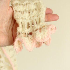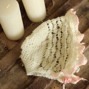 Darling vintage baby sweater and bonnet from the 1950s or 1960s. Soft ivory knit with pink trim. Bonnet has satin rosettes. No labels. Looks and feels like a blend. See condition below as this has some issues