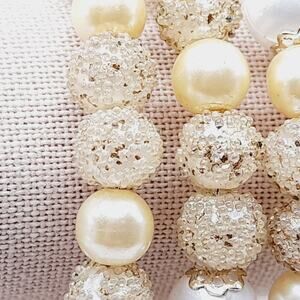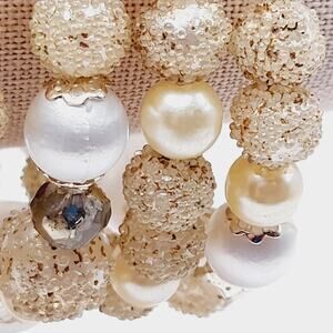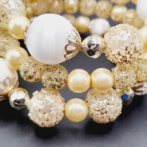 This elegant bracelet combines the timeless beauty of vintage 1950s beads with the durability of a new memory wire wrap. Featuring a mix of shimmering gold-tone textured beads and luminous faux pearls, the bracelet wraps comfortably around the wrist for a secure and stylish fit.