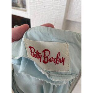 Elegant vintage 1950s Betty Barclay fit and flare dress featuring beautiful blue embroidery circles. Perfect for a retro-chic look. This dress zips up the back. No tags for fabric or size. The fabrich feels like a polished cotton. See my photo of the measurements of the dress taken flat from one side. This dress was recently taken out of a closet from an estate where it hung for decades. While there are no stains there is a slight tint of yellowing age on the top part and the shoulders. This may come brighter with cleaning but due to the age of it I left it as found. Overall in good vintage wearable condition.