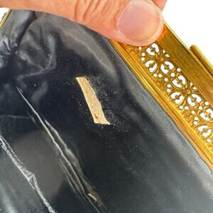 Inside, you’ll find a classic black satin or faille lining with a sewn-in “Made in Hong Kong” label. Please note there is a small, slightly tacky area inside the lining where an old price tag was removed—otherwise, the purse is in excellent vintage condition with only minor wear typical of age.