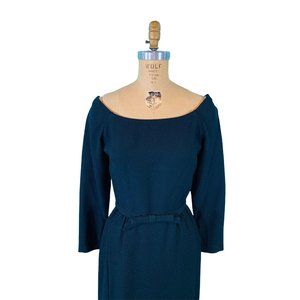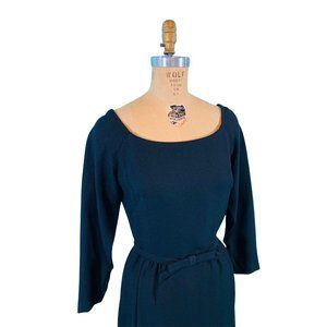A vintage 1950s black dress that will having you striking a pose with every turn! This stunning little black sheath dress has 3/4 quarter sleeves with zippers on the end of the sleeves, a fitted bodice with a matching bow belt that can be worn in the front or the back, a lovely boatneck/slightly off the shoulder neckline and an a-line skirt. Dress closes with a back metal zipper. No longer has a brand/designer tag but feels very well made.