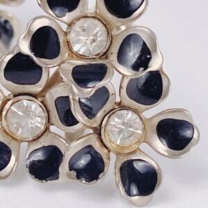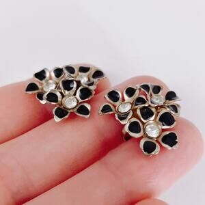 Vintage 1950s Black Enamel and Rhinestone Floral Cluster Screw Back Earrings
