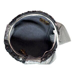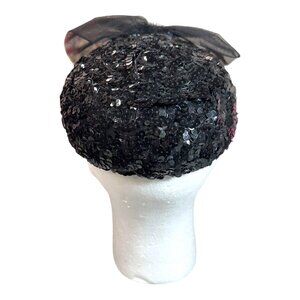 Vintage 1950s Black Sequin Pillbox Hat W/ Sheer Bow & Hair Clips Comb Church