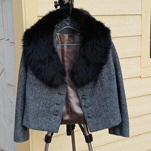 Vintage 1950s Black & White Wool Tweed Skirt Suit with Black Fox Fur Collar EUC Sz Approx 8/10 * Check Measurement